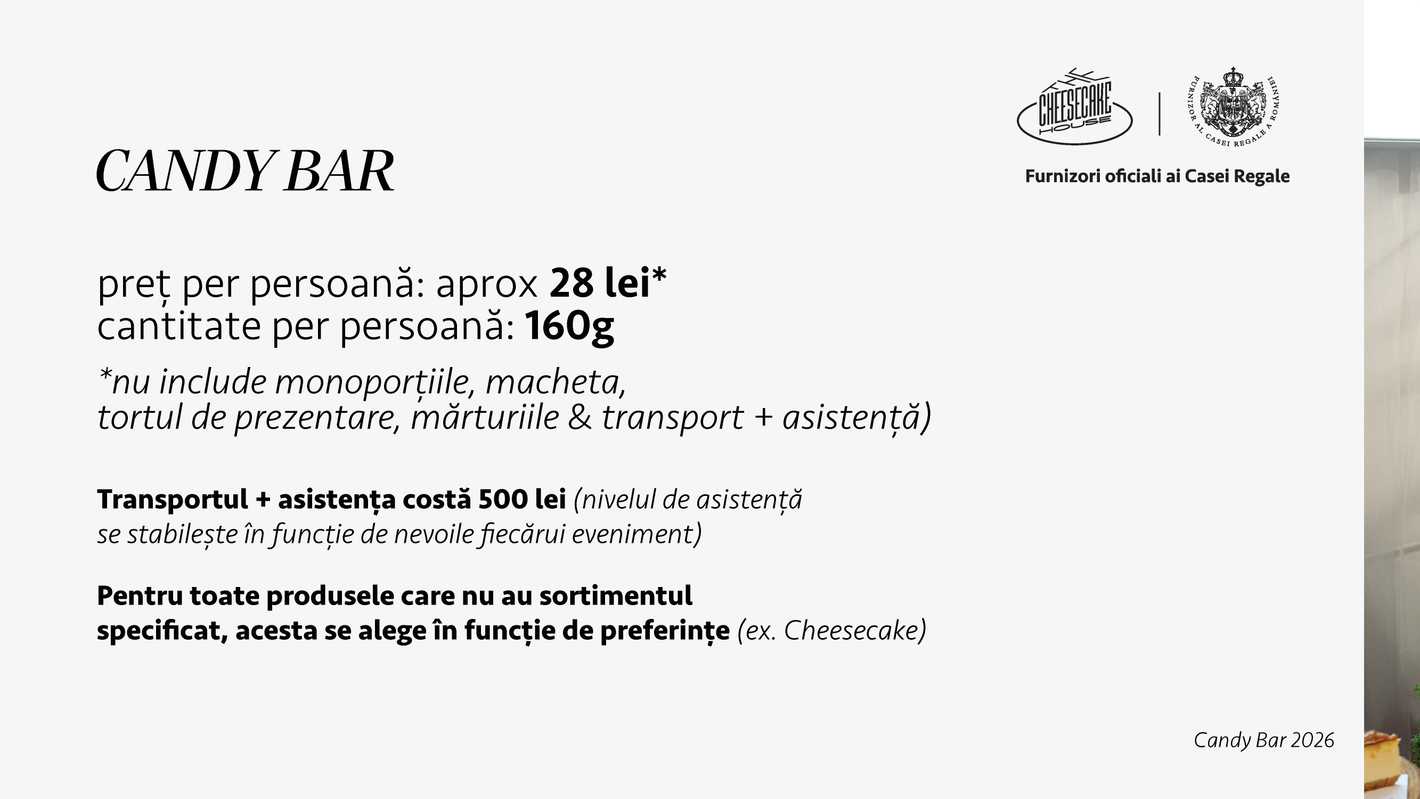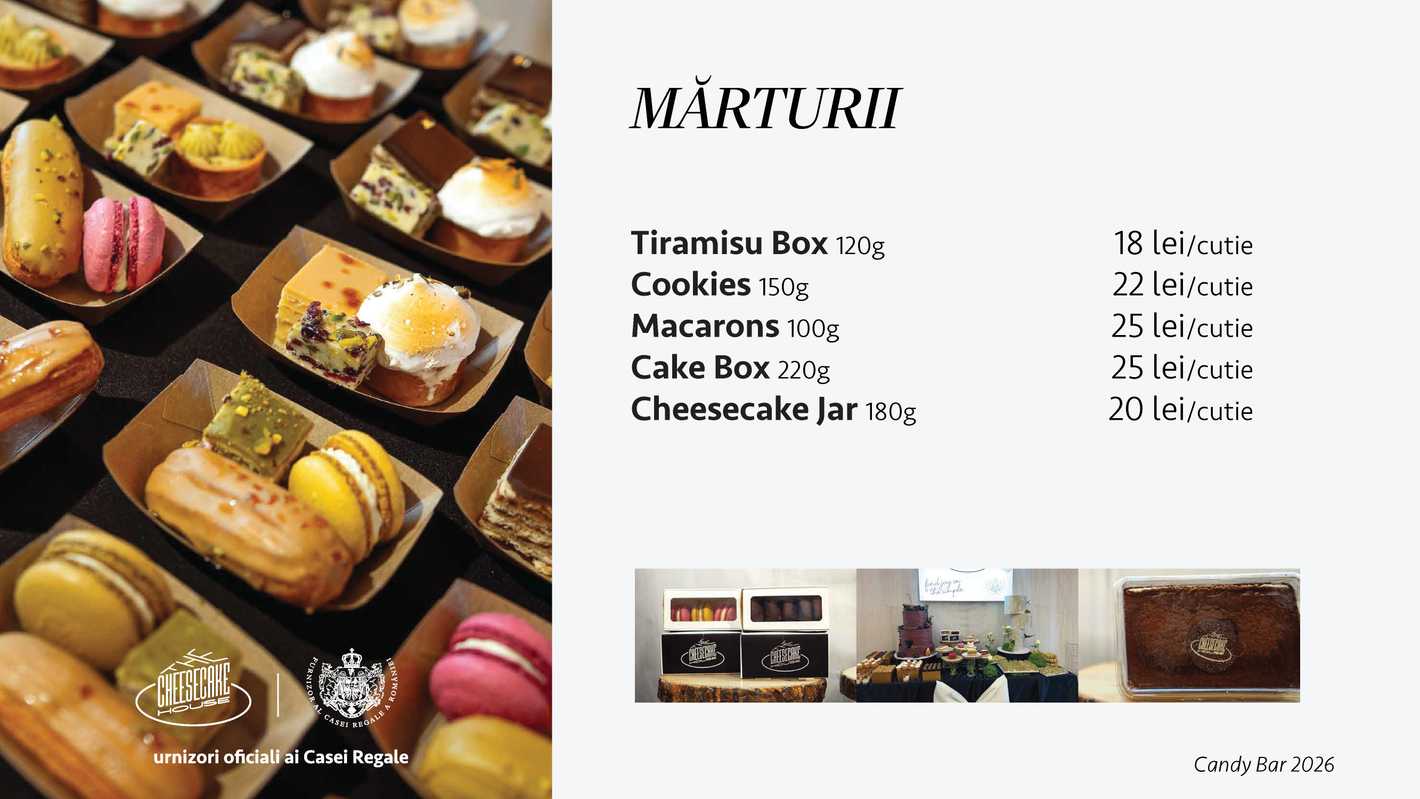 Petrecerea perfectă presupune un mix alcătuit din foarte multe elemente, unul dintre acestea fiind candy bar-ul. Așadar, vrem să transformăm fiecare petrecere într-o poveste plină de savoare și culoare, iar pentru asta vă oferim consultanță în alegerea produselor preferate, pentru a crea decorul dorit, îmbinat cu tematică petrecerii.